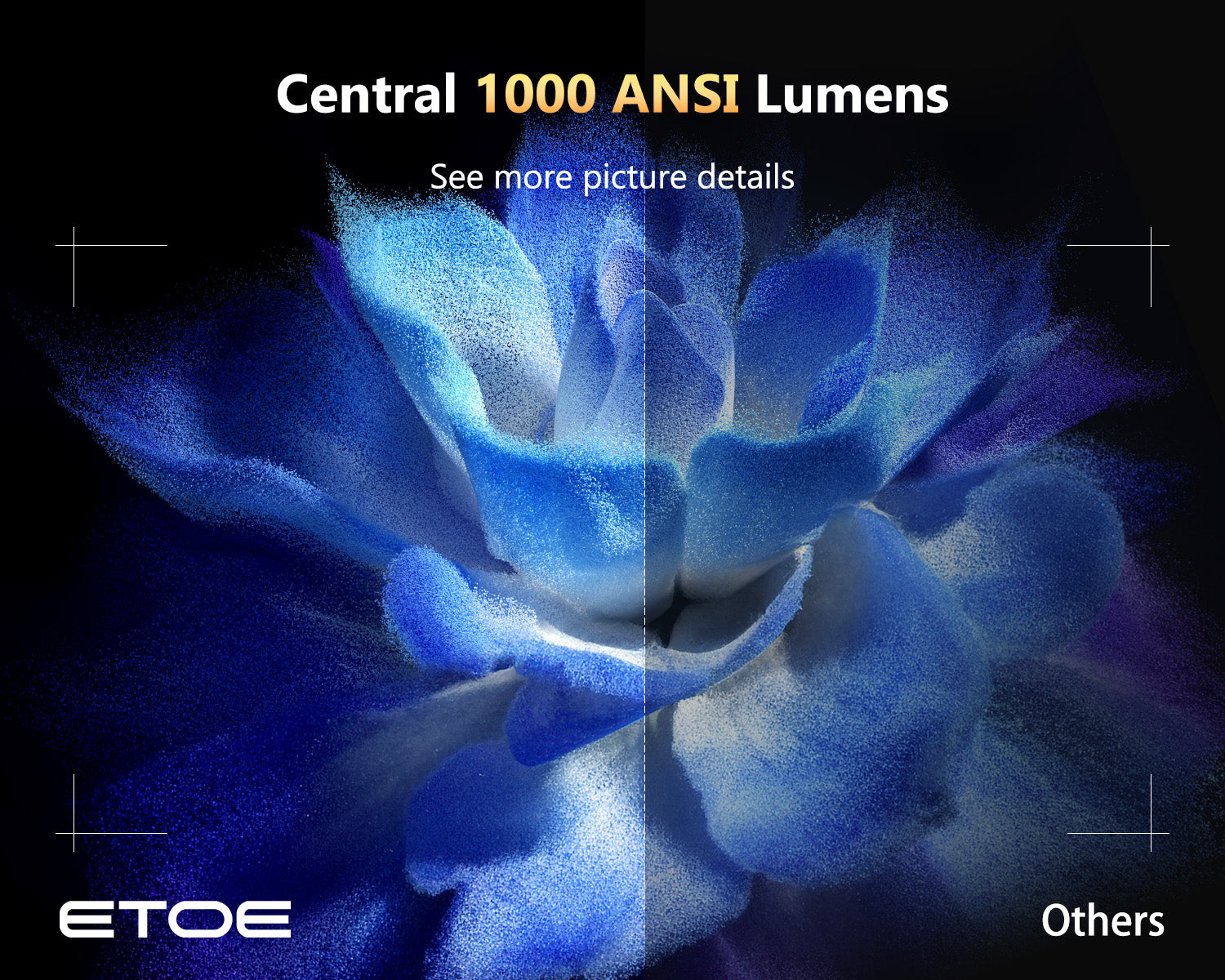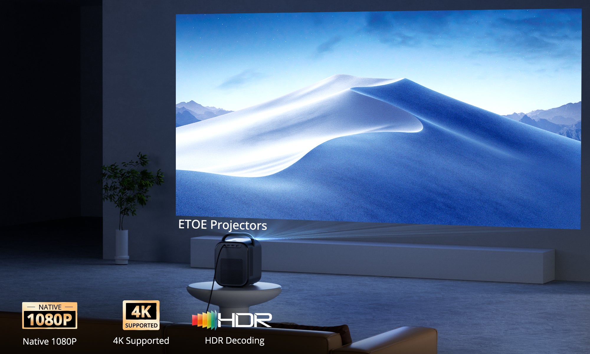 Der ETOE Seal Pro Projektor bietet eine native Auflösung von 1920 x 1080 Pixeln, eine Helligkeit von 1000 ANSI-Lumen und HDR-Unterstützung und liefert lebendige, naturgetreue Bilder. Tauchen Sie mit diesem Projektor in atemberaubende Bilder ein.