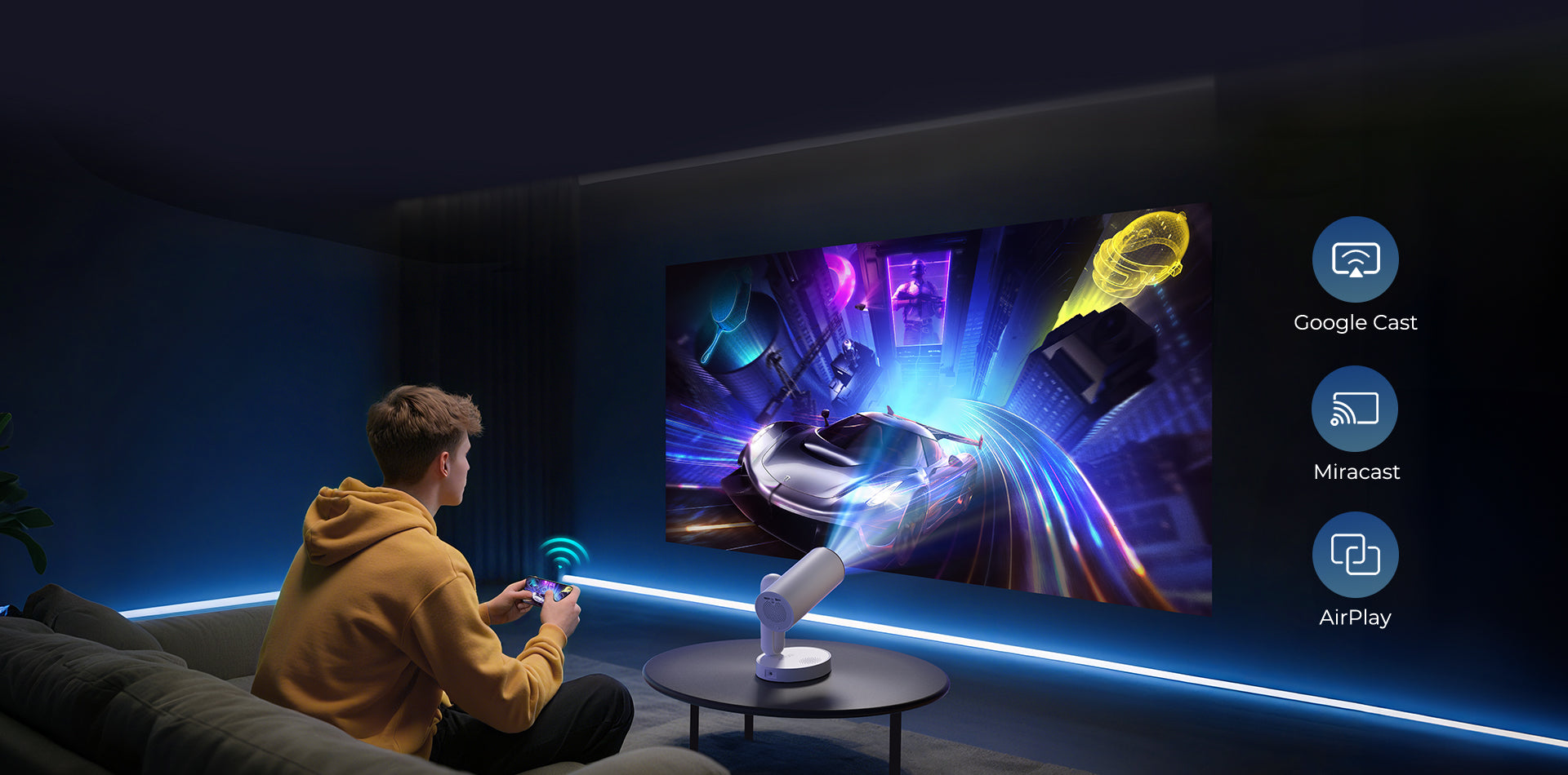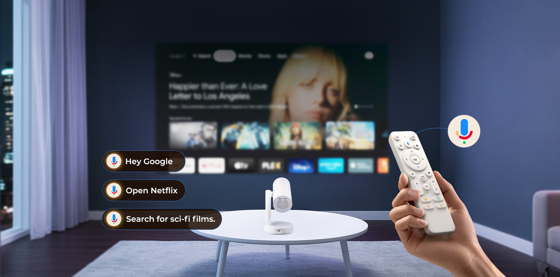 Trasforma il modo in cui interagisci con il tuo proiettore utilizzando l'intuitiva impostazione di ricerca vocale “Ehi Google”. Con un semplice comando vocale, puoi accedere istantaneamente a un'ampia gamma dei tuoi canali e app preferiti, rendendo incredibilmente facile goderti il tuo intrattenimento preferito.