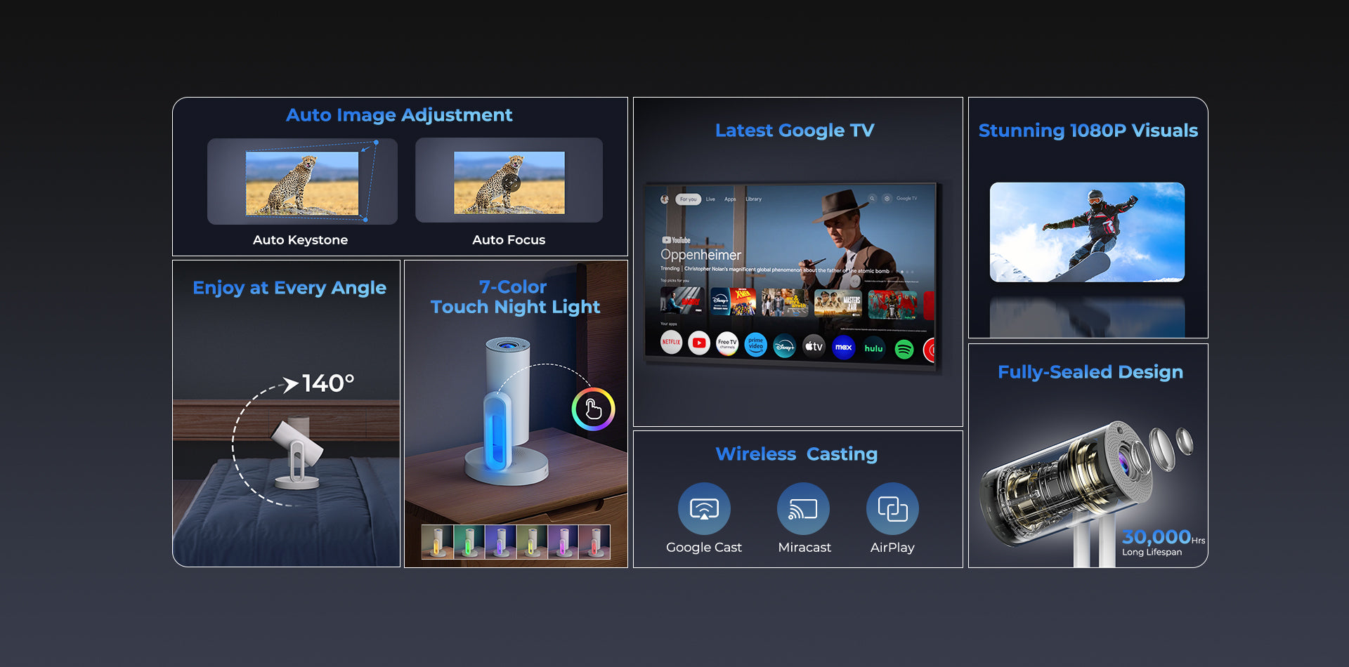 Con un'impressionante regolazione angolare di 140°, questo proiettore ti consente di proiettare contenuti su varie superfici, sia sul soffitto, su soppalchi inclinati, soffitti a falda, o in quegli angoli raramente utilizzati della tua casa. La funzione avanzata di correzione automatica del keystone del proiettore regola senza sforzo l'immagine, correggendo le distorsioni e garantendo una proiezione perfettamente modellata ogni volta, elevando la tua visione a un'esperienza eccellente.