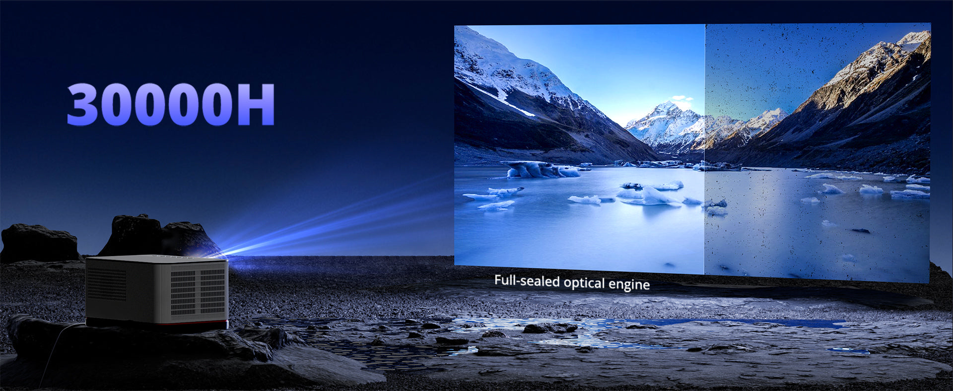 The integrated, fully sealed optical engine protects the core components of the projector from dust and debris and maintains optimal image quality, providing years of black spot-free and maintenance-free use and ensuring a long service life of 30,000+ hours.