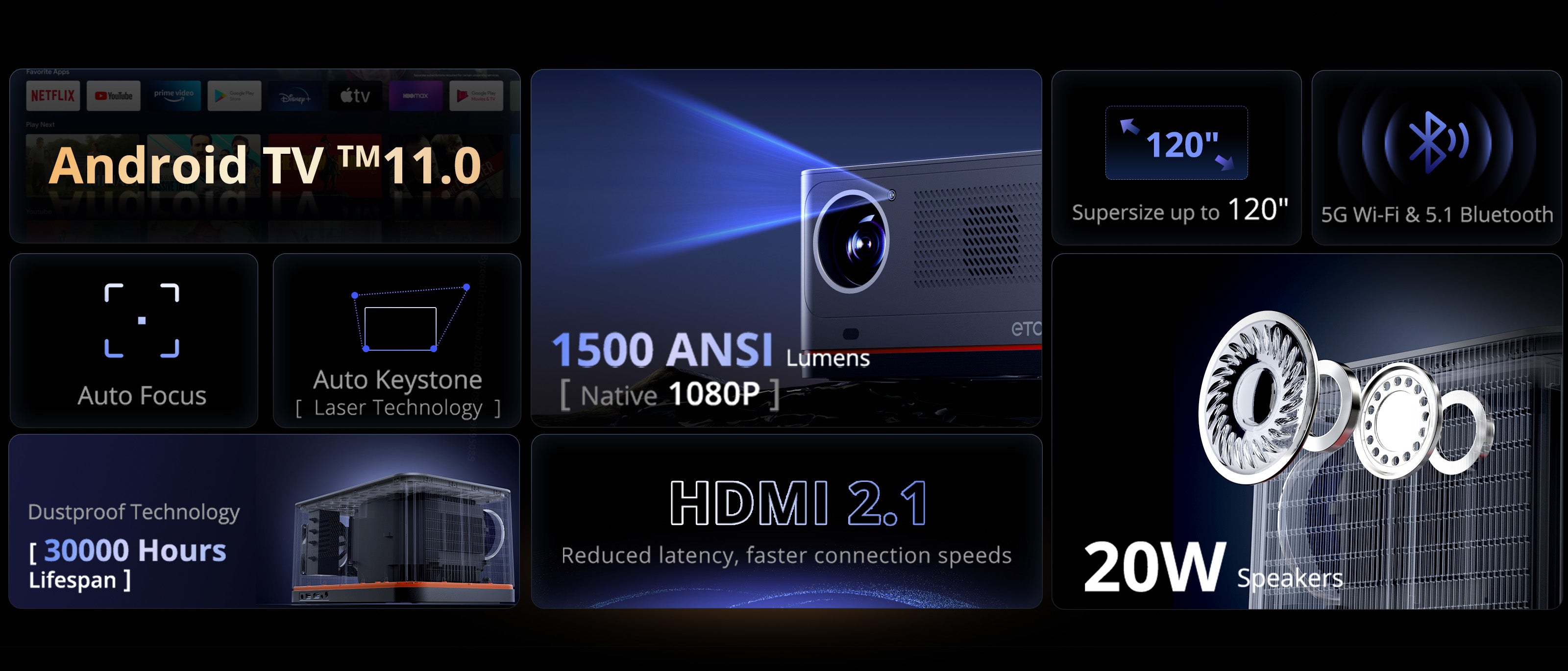 The ETOE Whale Pro projector provides true-to-life images with its native 1920*1080 resolution, a brightness of 1500 ANSI lumens and HDR10 decoding. The 1500 ANSI lumens in the centre deliver more image details. Its high-end Amlogic 905 CPU supports 4K UHD video decoding. Immerse in stunning, colorful visuals with this projector.