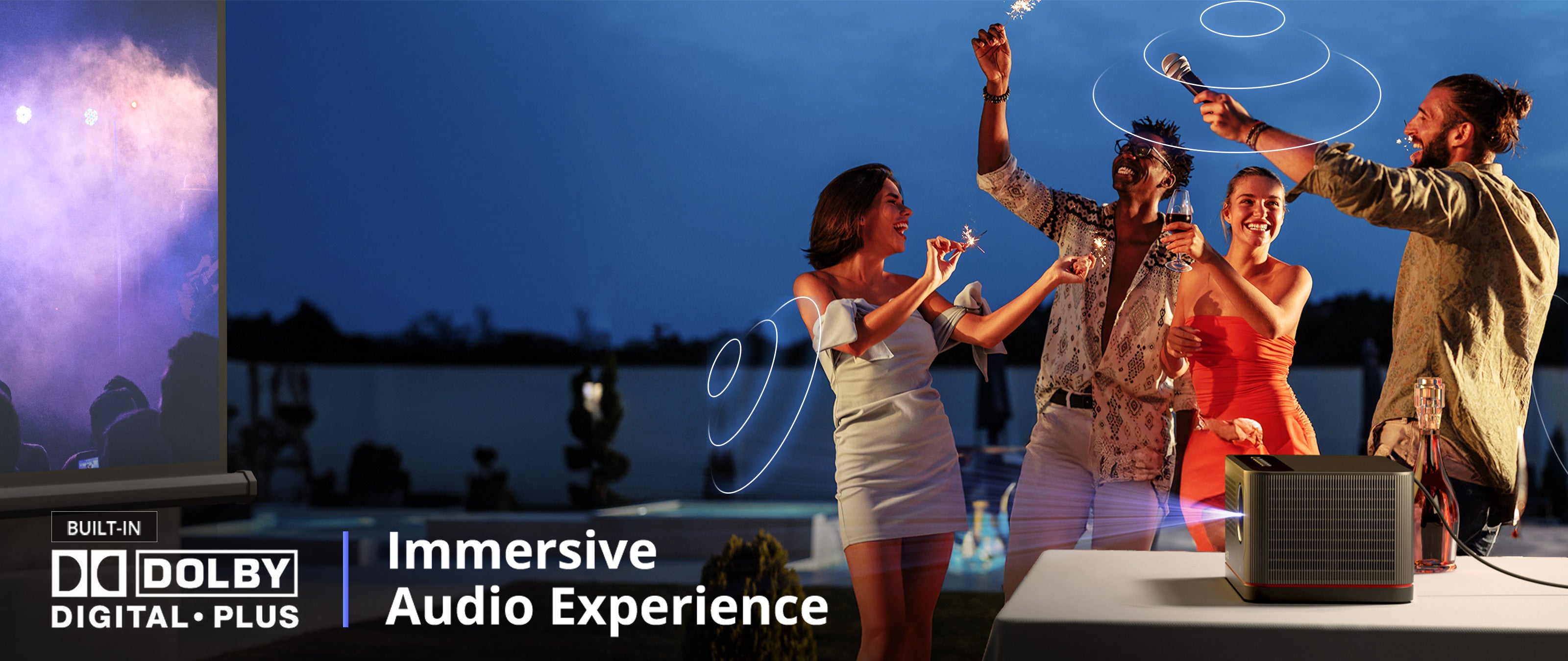 The ETOE Whale Pro projector boasts dual speakers (2*10W), providing you with an immersive theater audio experience. With various sound modes, such as standard, movie, and music modes, users can also create their own custom sound modes for optimal audio performance. With its Dolby Audio certification, it ensures high-quality sound for a captivating audiovisual journey.